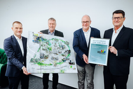 175 Jahre WESTFÄLISCHES VOLKSBLATT: Zum Jubiläum der großen Heimatzeitung gab es jetzt eine Auszeichnung der Werbegemeinschaft Paderborn. Vorsitzender Uwe Seibel (2.v.r) und geschäftsführender Vorstand Lin Thiele (links) überreichten die Urkunde sowie ein Bild der Künstlerin Ulla Mersch an Geschäftsführer Frank Best (rechts) sowie Karl-Heinz Hecker (Leiter Werbemarkt,2.v.l). Beide bedankten sich für die Auszeichnung. Seibel betonte die gute Zusammenarbeit und das Sponsoring zum Frühlingsfest. Die Kooperationen im geschäftlichen Bereich seien eine Erfolgsstory für Paderborn. Das WESTFÄLISCHE VOLKSBLATT gehört der Werbegemeinschaft seit 40 Jahren an. Foto Jörn Hannemann